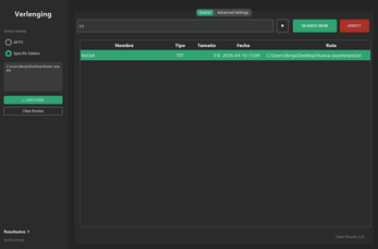 You can scan your entire computer or select specific folders. It displays the results in a table with the file name, type, size, date, and path, and allows you to sort them. You can also open files, view them in their folder, copy the path, delete them, or view their properties.